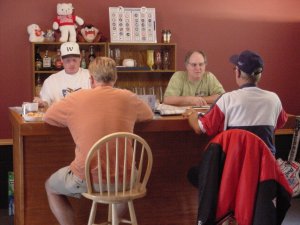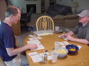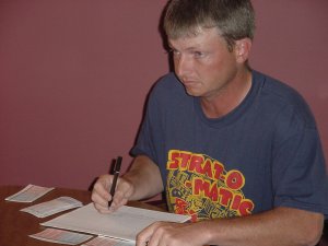 July 1st, 2001 — Tim & Jennifer Turner hosted the well attended Strat-o-Thon. Biggest trade of the day was when Dave traded 5 small (six sided) dice for Mike Parker’s King Kong 20 dice (psssst Dave… it only rolls 11+). The food (thanks again Jennifer) was excellent and a great time was had by all. Click on each photo to bring up full size.